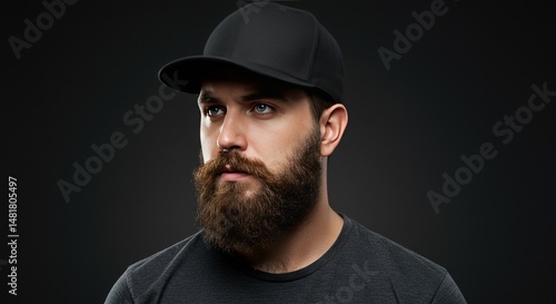 man, portrait, beard, serious, intense, dark background, hat, cap, dark, moody, stylish, confident, masculine, adult, male, head shot, facial hair, closeup, grey shirt, blue eye, studio shot, shadow, modern, trendy, bearded man, guy, person, fashion, style, expression, monochromatic, simple, clean, isolated, low key, photo, posing, model, photogenic, attractive, cool, brooding, tough
