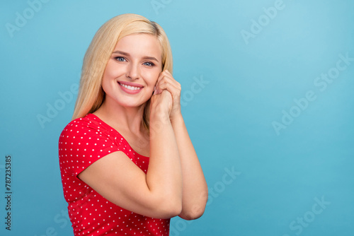 Photo portrait woman blonde hair cute nice smiling isolated pastel blue color background