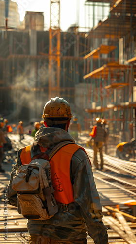 Photo realistic image of a foreman supervising construction workers on site, ensuring adherence to safety protocols and maintaining productivity standards - Construction and supervision concept
