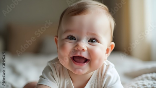 photograph of a cute, smiling baby boy with a happy expression