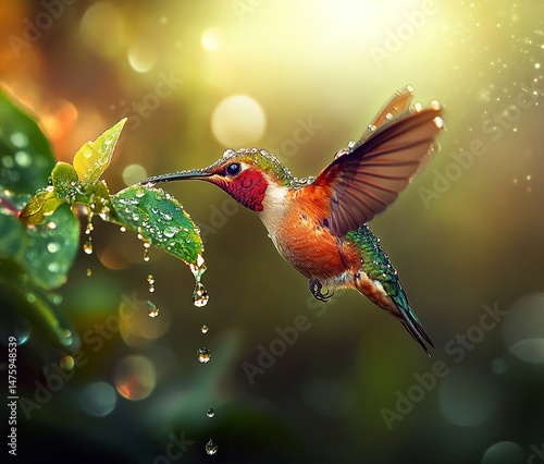 Photograph of a hummingbird in flight, drinking water droplets from a leaf tip. Macro photography, nature background, high resolution, high detail, real photograph. generative ai