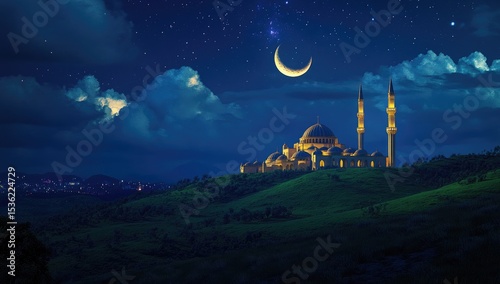 Photograph of a mosque atop a hill, with a beautiful night sky and moon, green grassy hills, and stunning clouds in the dark blue night sky,