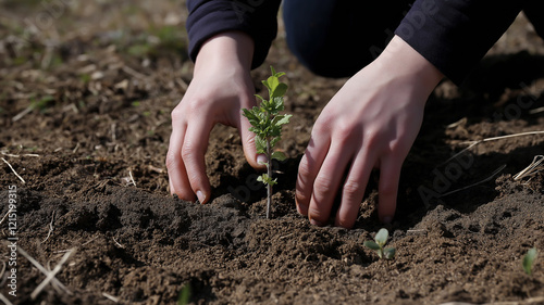 Photograph of a of hands planting a young tree during Tu Bishvat, symbolizing the holiday's theme of renewal and growth