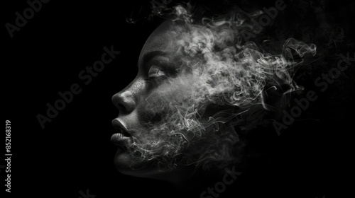 Photograph of a smoke frame forming a stylized portrait of a human face, revealing the ethereal nature of existence, on a transparent background.
