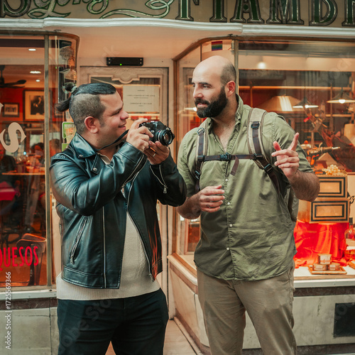 Photographer and Tourist engaging in Front of Traditional Spanish Shop in Madrid, Spain