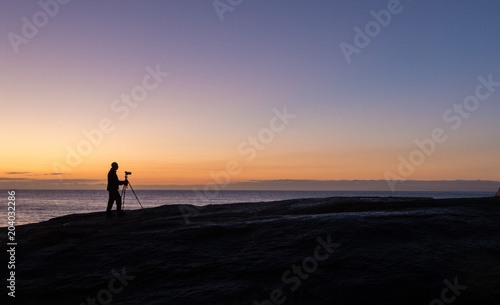 photographer, dawn, water, tripod, silhouette, australia, rock, sea, sunrise, tasmania, beach, camera
