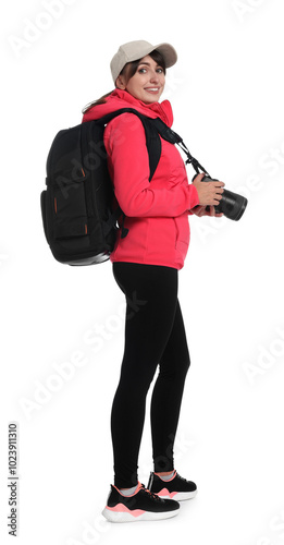 adult, adventure, background, backpack, business, camera, cap, career, caucasian, device, digital, electronic, equipment, female, full, happy, hobby, isolated, journey, leisure, length, lens, lifestyle, media, memory, modern, person, photo, photograph, photographer, photographing, photo, portrait, profession, professional, shoot, shot, smiling, studio, stylish, technology, tool, tour tourism, travel, white, woman, work, young