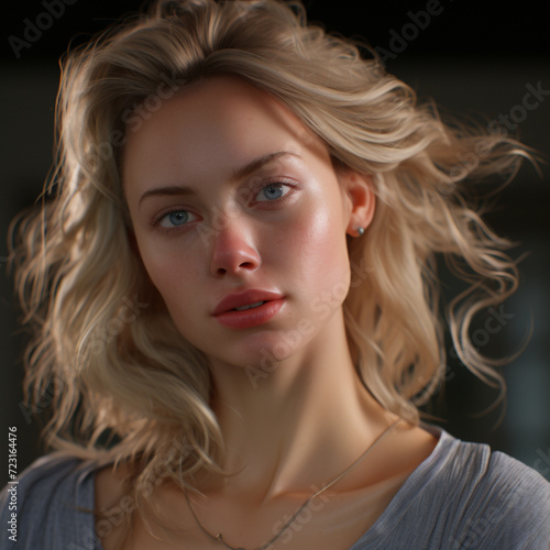 Photographic portrait of a smiling blonde woman, photo of a beautiful woman, young blonde woman, female model, Russian woman.