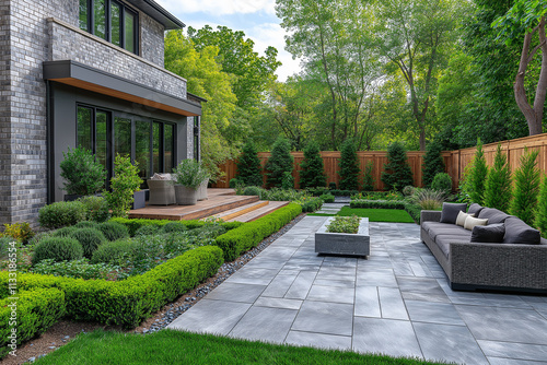 Photographie immobilière d'un jardin minimaliste contemporain avec chemin en pierre et haies soigneusement taillées