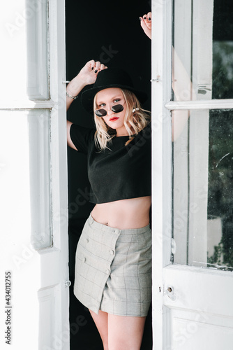 Photography of girl posing, in a session, fashion, with elegant clothes, lens and technology.