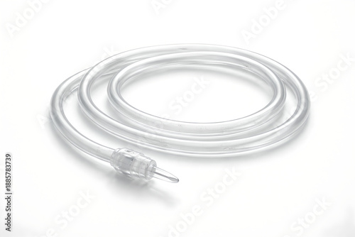Photorealistic 3D macro product-shot of unbranded transparent IV tubing arranged in a smooth S-curve on a pure white surface, clear polymer refraction and subtle micro-scratches