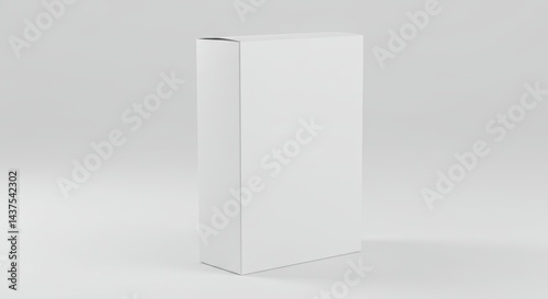Photorealistic 3D render of a standard rectangular cereal box standing upright on a plain white surface. Blank box surfaces are the focus
