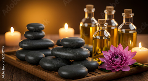 Photorealistic close-up of hot massage stones on a bamboo tray with herbal oil bottles and a blooming flower