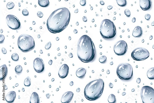 Photorealistic digital artwork showing a pattern of water droplets on a white background