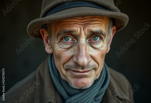 look, people, hat, muted, copy, background, portrait, partially, attention, direct, smile, mood, space, human, poor, photorealistic, insertion, sharpened, eye, coat, natural, sharp, sad, gaze, face, visible, body, melancholic, determined, lighting, man
