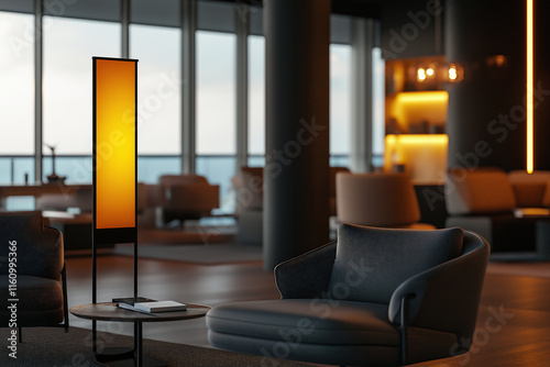 Photorealistic roll-up banner mockup in a modern corporate lobby interior showcasing copy space