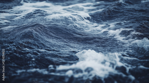 Photorealistic sea background with deep blue and white waves, gentle ripples, and natural water reflections, capturing the serene and dynamic beauty of the ocean for tranquil and refreshing designs