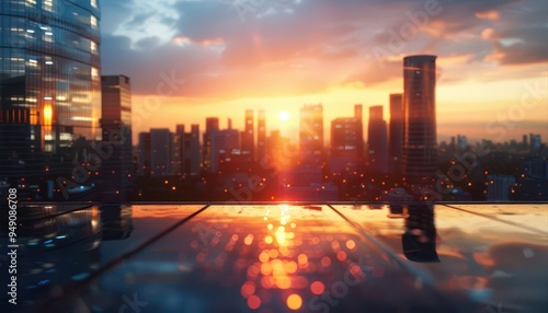 Photorealistic urban skyline at sunrise, modern buildings with a soft golden glow, clear sky, highdefinition, vivid colors, hyperdetailed textures