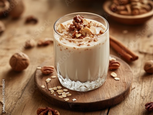 Photorealistic visualization of a healthy breakfast featuring oat milk, nuts, and fresh fruits served on a wooden table in the context of fresh fruit, food photography style