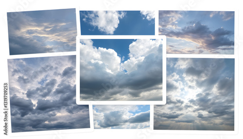 sky, weather, collage, isolated, white, highlight, cloudy, sunny, rainy, stormy, clear, dramatic, scenic, beautiful, majestic, serene, tranquil, aethereal, vibrant, colourful, atmospheric, peaceful, breathtaking, mesmerizing, captivating, striking, impressive, magnificent, overcast, hazy, foggy, misty, snowy, windy