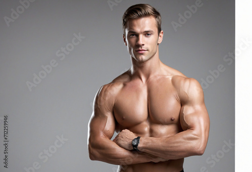 Photoshoot of a fit, shirtless male model flexing muscles. Sculpted physique of a young bodybuilder on display.
