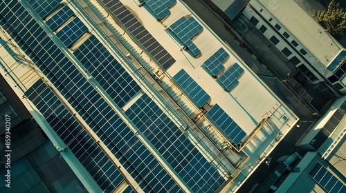 Photovoltaic solar panels mounted on industrial building roof for producing green ecological electricity Production of sustainable energy concept : Generative AI