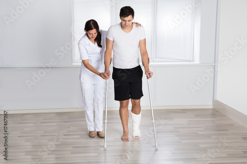 Physiotherapist Assisting Injured Patient To Walk With Crutches