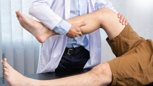 physiotherapist doctor rehabilitation consulting physiotherapy giving exercising knee treatment with patient in physio clinic or hospital.
