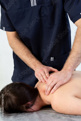 Physiotherapist or massage therapist working on patient injury treatment doing rehabilitation pain therapy in clinic.