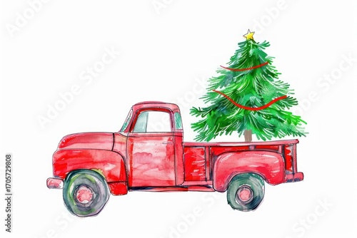 christmas decoration, christmas tree, holiday season, illustration, celebration, decoration, watercolor, christmas, transport, whimsical, isolated, festive, holiday, machine, texture, vehicle, vintage, season, plant, style, truck, wheel, cute, pine, tree, art, red, festival, transportation