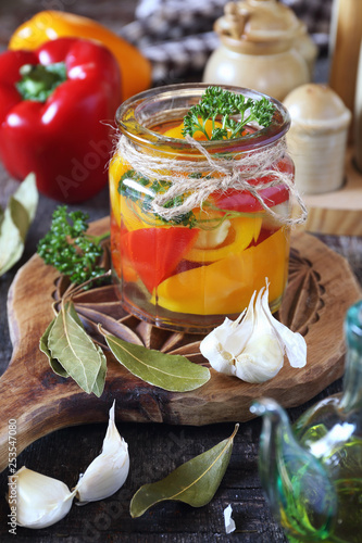 garlic, olive oil, bay leaf, red, yellow, canned, glasses, paprika, food, spice, dark, background, preserve, marinated, sweet, ingredient, cooking, vegetarian, homemade, can, preservation, preserving, canning, bright, parsley