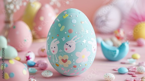 Picture an Easter egg decorated with cute bunny and chick motifs, surrounded by festive decorations and candy.