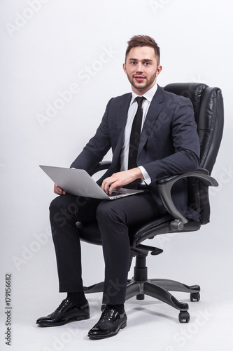 laptop, businessman, manager, portrait, professional, person, confident, smile, smiling, young, office, hair, adult, 1, male, caucasian, people, lady, business, men at work, looking, cheerful, white, work, style, executive, office worker, beautiful, modern, brunette, arm, face, corporate, space, attractive, success, working, document, guy, sitting