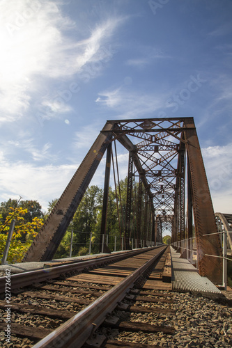Picturesque close up angular view of iron and wood railroad trestle train tracks and bridge canopy, with green lush trees and vegetation, blue sky with wispy white clouds, daytime - Oregon USA