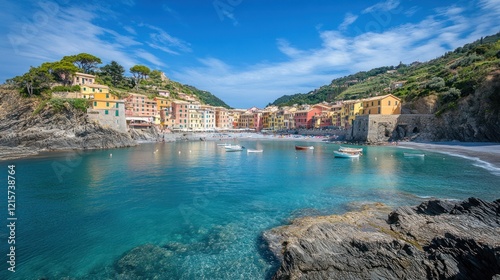seascape, coastal, village, mediterranean, italy, ocean, beach, sea, water, coast, summer, turquoise, blue, house, building, cliff, rock, hill, landscape, panorama, scenic, travel, vacation, holiday, destination, beautiful, view, colourful, vibrant, sun, sky, day, boat, breakwater, shore, calm, serene, paradise, idylli