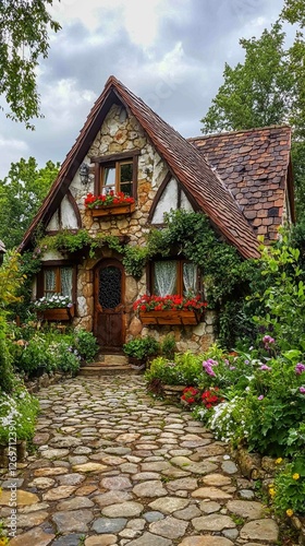 Picturesque Cottage with Steep Pitched Roof Surrounded by Flowers
