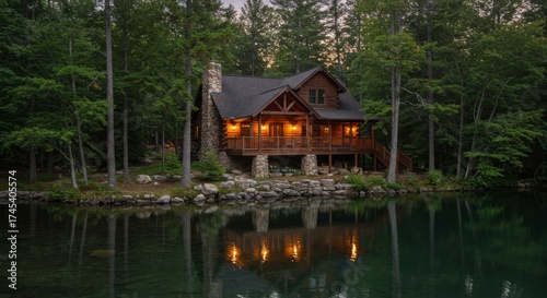 Picturesque Log Cabin with Stone Chimney Reflected in Calm Lake Amidst Lush Forest