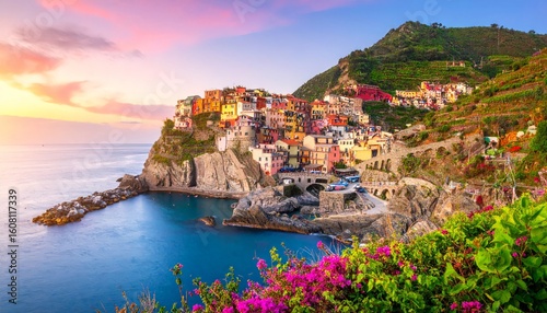 italy, coast, seascape, sunrise, golden hour, colourful, house, village, town, cliff, rocky coast, sea, water, landscape, scenic, travel, tour tourism, vacation, idylli, tranquil, serene, romantic, architecture, building, hillside, terraced, vegetation, flower, pink flower, summer, morning, light, europa, picturesque, charming, beautiful