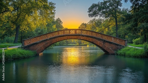 Picturesque park bridge over a calm lake at sunrise. Lush green trees frame the arching brick bridge reflecting golden light on the water.