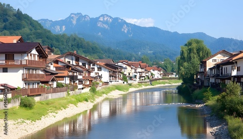 Picturesque river town nestled in a valley, surrounded by mountains and lush greenery on a sunny day