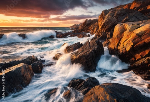 picturesque rocky shore crashing waves, ocean, sea, water, coast, shoreline, beach, rocks, boulders, cliffs, rugged, horizon, erosion, seascape, tranquil