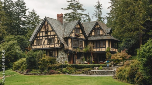 Picturesque Tudor style home nestled amidst a lush forested landscape