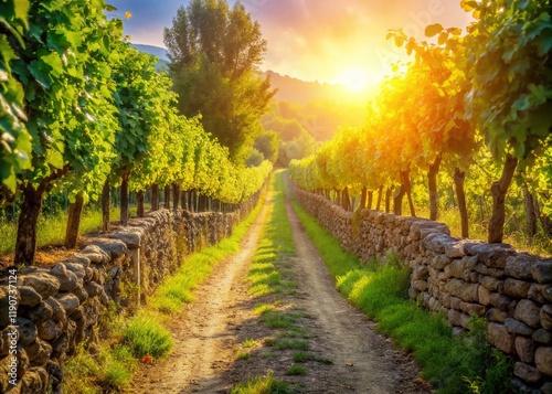 Picturesque Vineyard Road with Stone Walls, Sunlit Grapes, Rural Landscape
