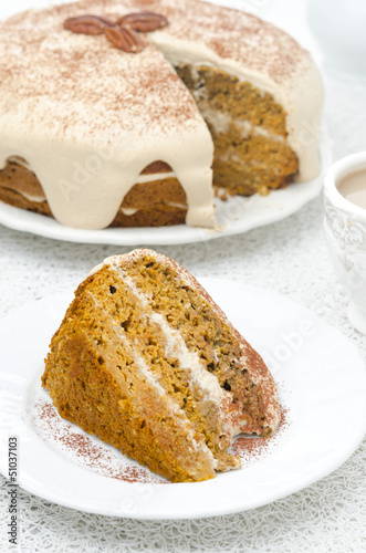 piece of carrots and pumpkin cake with coffee cream on a plate