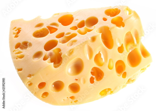 Piece of Swiss cheese on a white background.