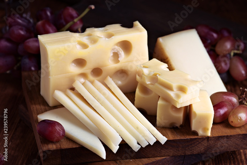 Pieces of cheese and bunches of grapes on wood illuminated with selective light