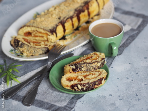 Pieces of pastry roll with apple jam filling, poured with chocolate icing and sprinkles, on a gray wooden background. Homemade pastries and a cup of coffee for breakfast.