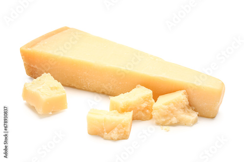 Pieces of tasty Parmesan cheese on white background