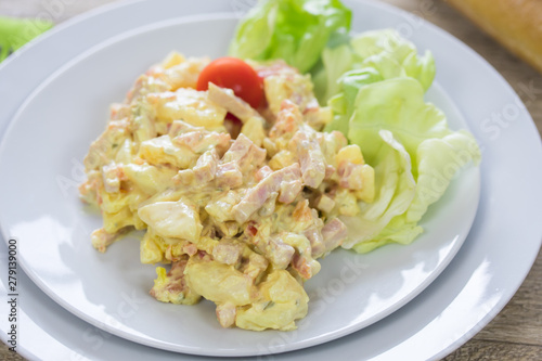 potato, mayo, ham, meat, salad, potato salad, food, plate, meal, summer, pickle