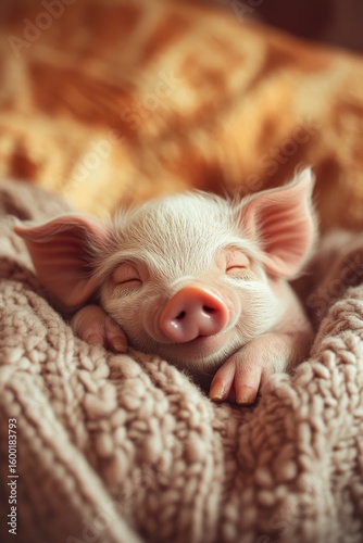 Pig is sleeping in a blanket. The blanket is brown and fuzzy. The pig is white and has black ears